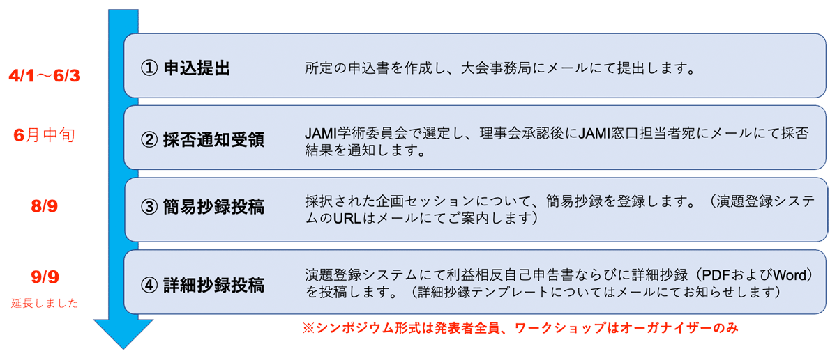 - 応募された企画はJAMI学術委員会で選定し、理事会で承認されます。応募多数の場合には、開催期間および会場規模の都合上、全ての企画を採択できないことがあります。採否は企画書に基づき、他の企画のテーマとの関係等を考慮して決定します。